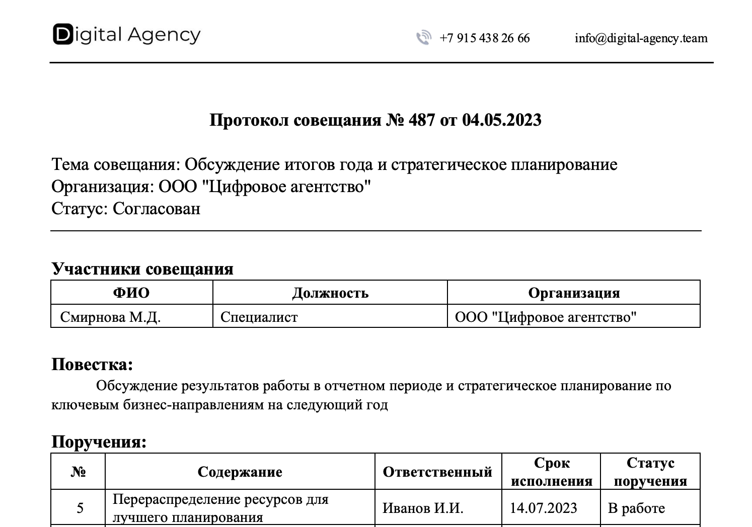 ИИ подготовит протокол совещания, указав тему, повестку, принятые решение, выданные поручения и исполнителей